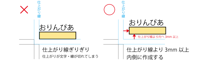 仕上がりサイズの端まで配置されている線や文字、画像がある場合、仕上げの断裁を行った際に文字切れ等を起こす場合があります。