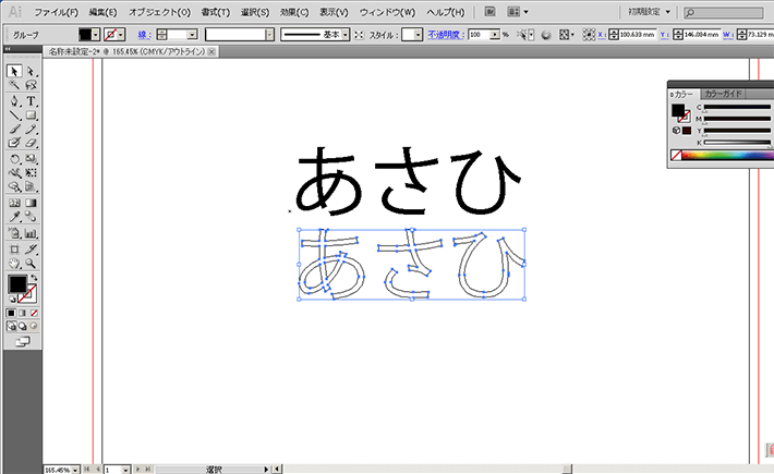 アウトライン化とは、文字を縁取りし図形化することです。アウトライン化した後に、文字を変更することはできなくなりますが、形だけが残りますので使用しているフォントがなくても、印刷が可能となります。